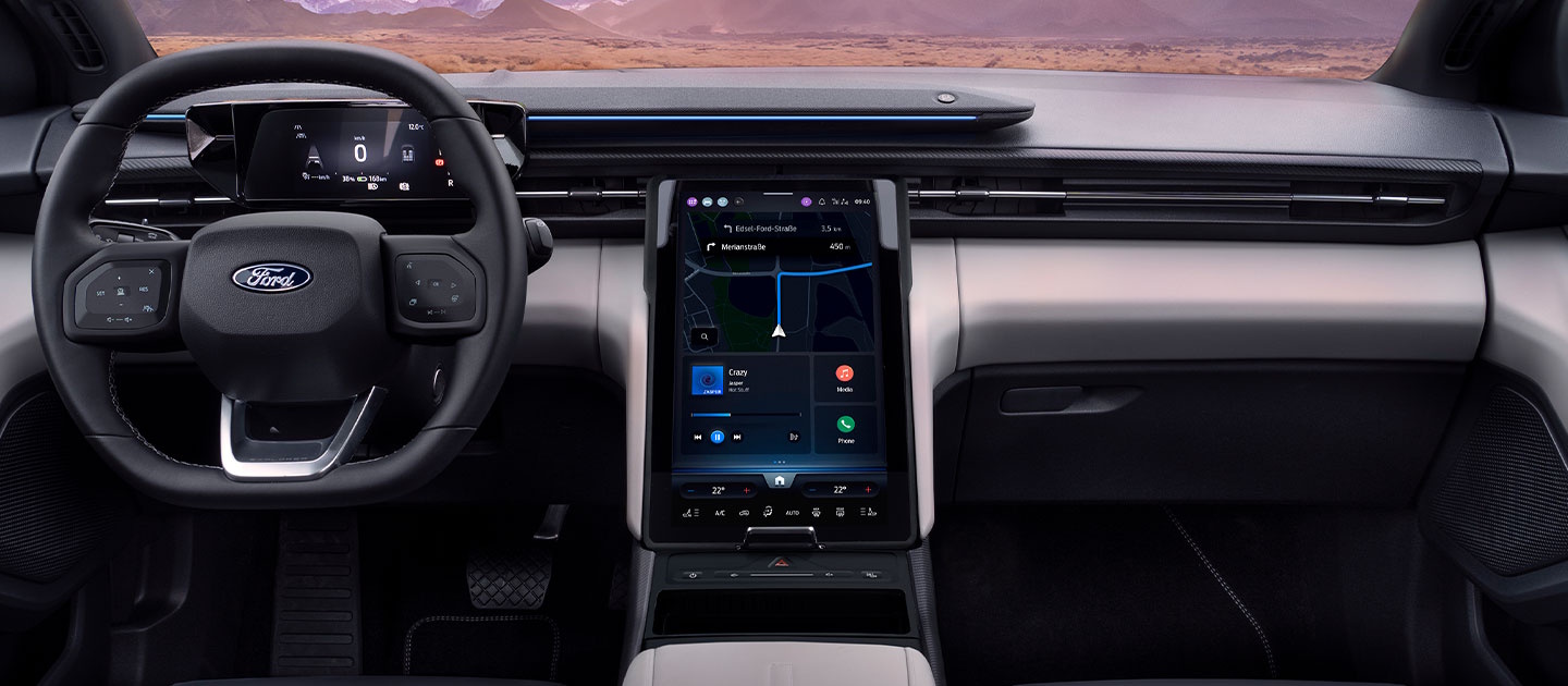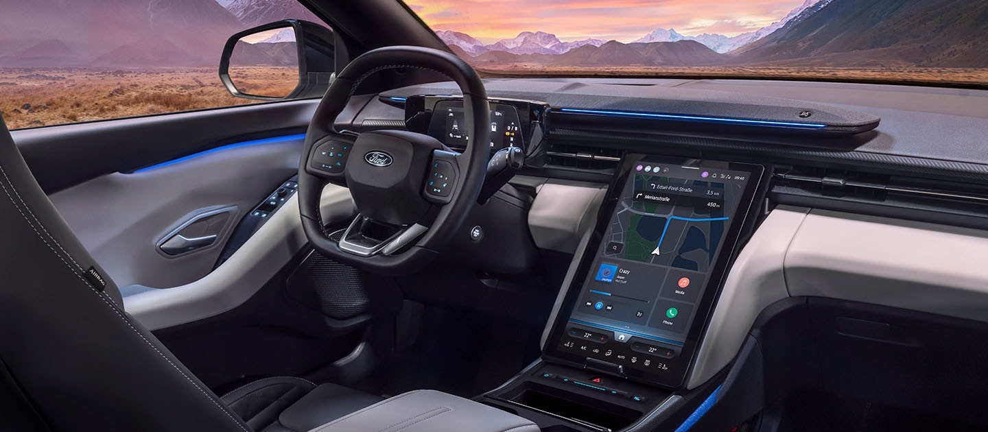 The 14.6" movable touchscreen comes with Ford's SYNC™ Move system**, a built-in EV trip planner and satellite navigation, to help ease your journey. Stay in the know with the built-in EV trip planner, giving live traffic updates, Cloud-enhanced route planning and charging stops, as well as live charging availability. Choose between five drive modes – Normal, ECO, Sport, Individual or Traction (AWD only) – to adapt to different road conditions. Free yourself from cables with the wireless charging pad for your smartphone in the centre console.