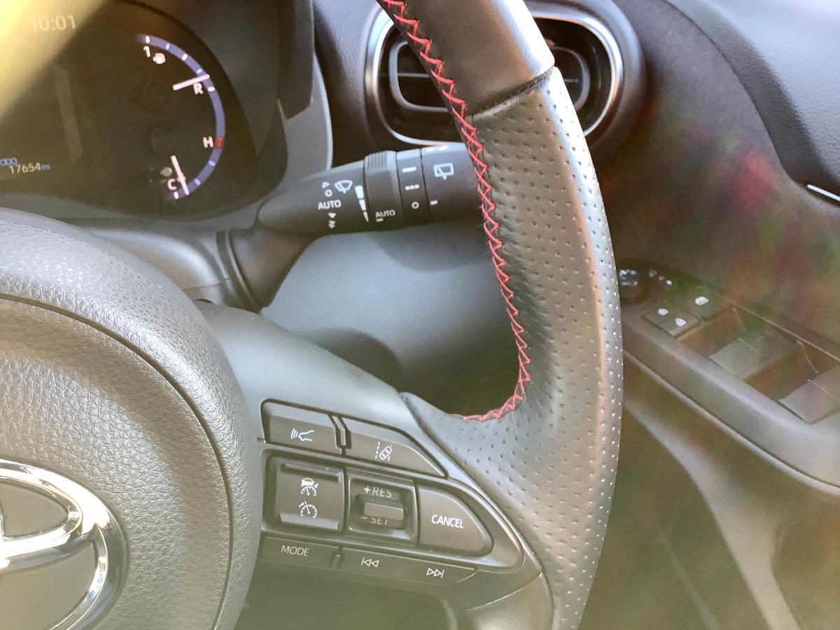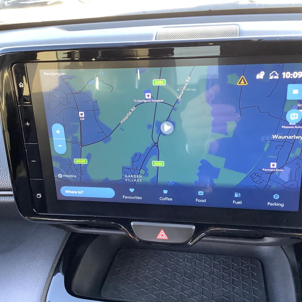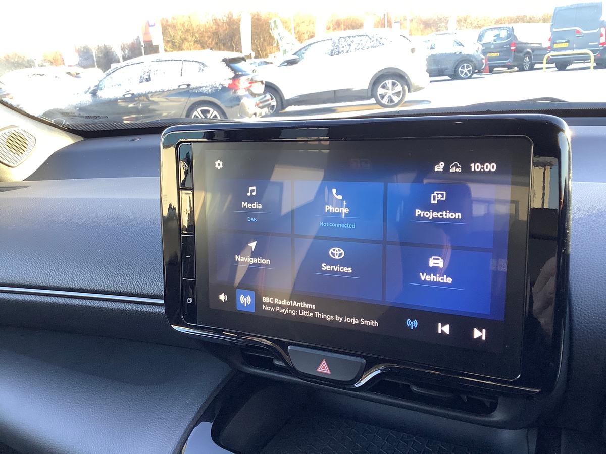 Specification highlights include the Toyota skyview panoramic roof, heated front seats, and dual zone automatic air conditioning, contributing to a high level of comfort for all occupants. The comprehensive technology suite comprises a 7" multi information display screen, DAB digital radio, Bluetooth connectivity, and My T Connected services, all accessible through steering wheel-mounted controls. Driver assistance and safety features such as intelligent adaptive cruise control, lane trace assist, a reversing camera, and a pre-collision system with pedestrian and cyclist detection provide reassurance and support in a range of driving conditions.