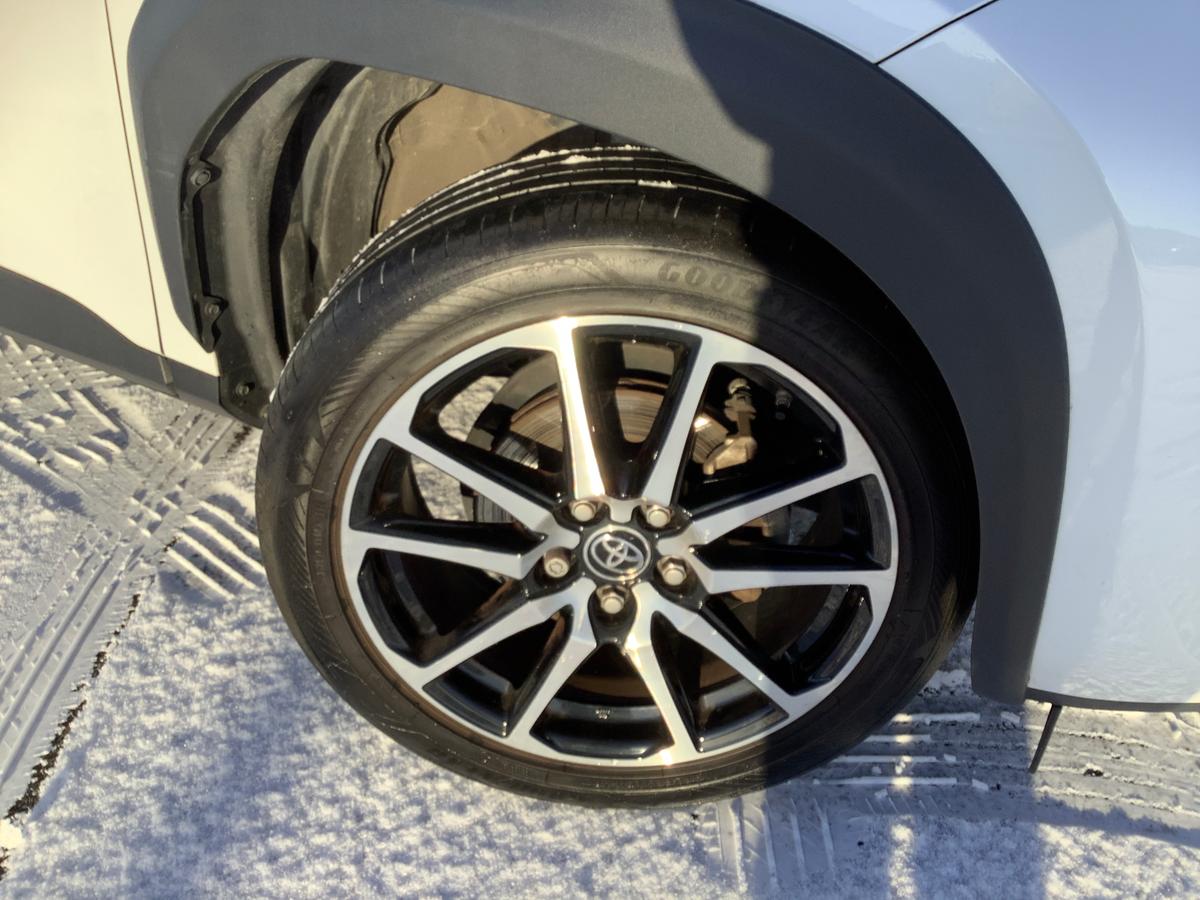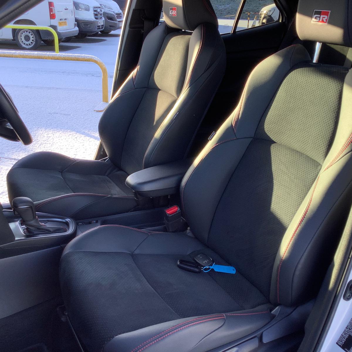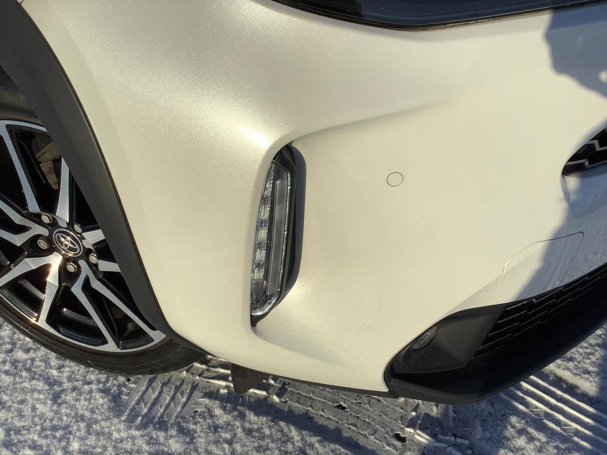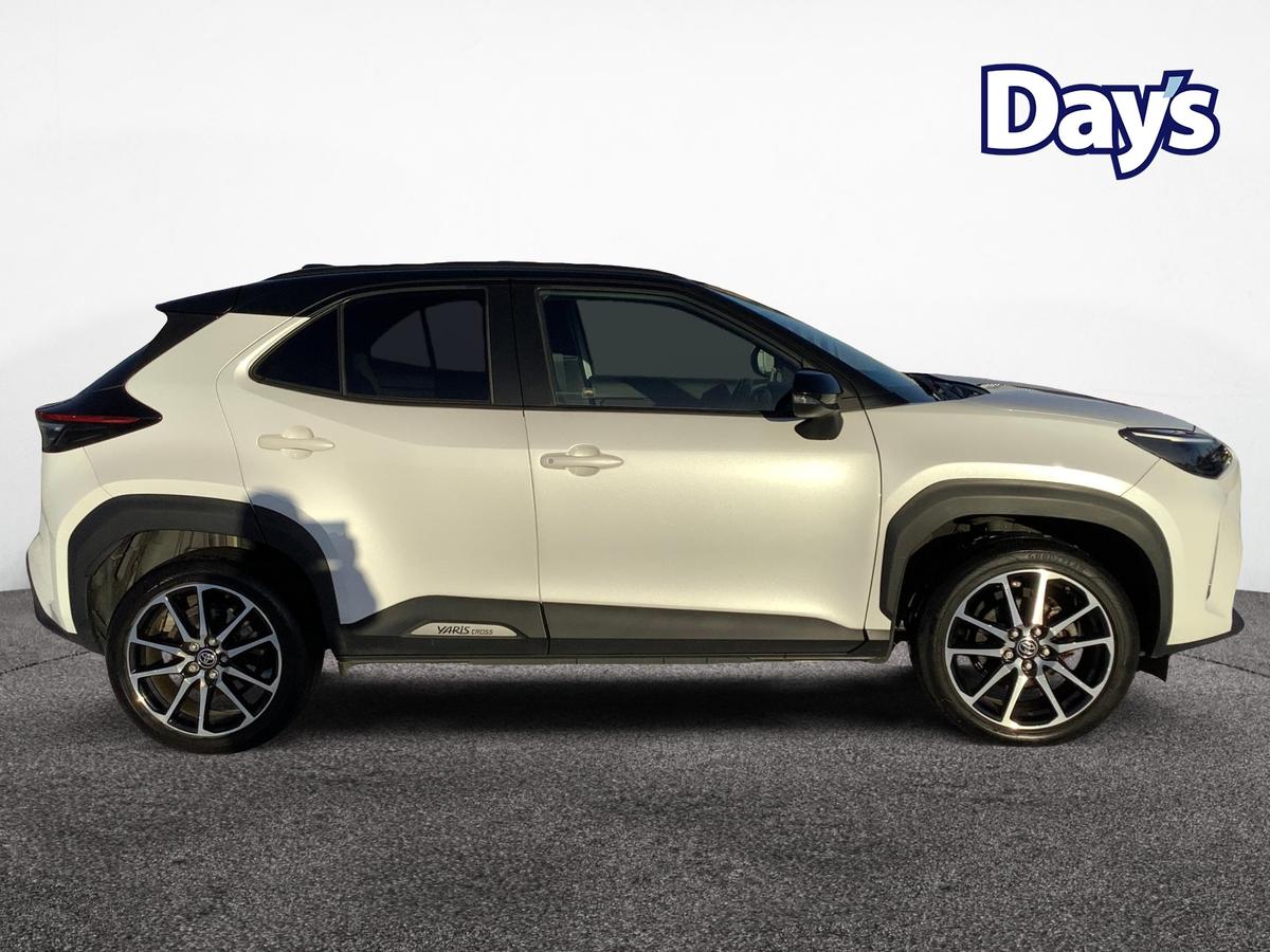 Finished in white, the exterior styling benefits from body colour door handles and a matching front bumper, complemented by black wheel arch mouldings and a gloss black upper front grille. Aluminium roof rails and the rear spoiler add a purposeful look, while the black rear under run and dark chrome plated grille insert emphasise the vehicle's modern character. Inside, the Yaris Cross features perforated alcantara and leather upholstery with black roof lining, sports seats, and light blue ambient interior lighting, creating a refined and inviting atmosphere.